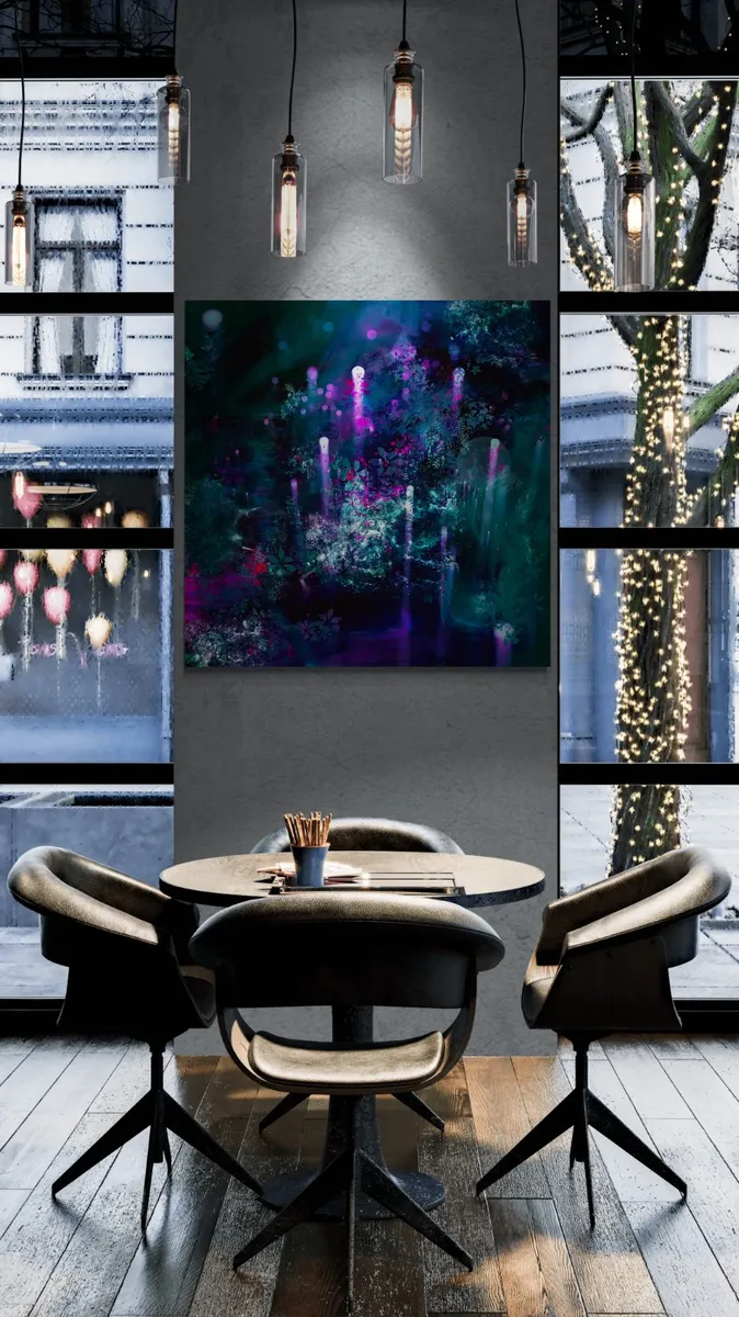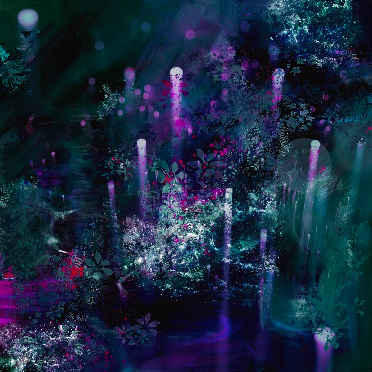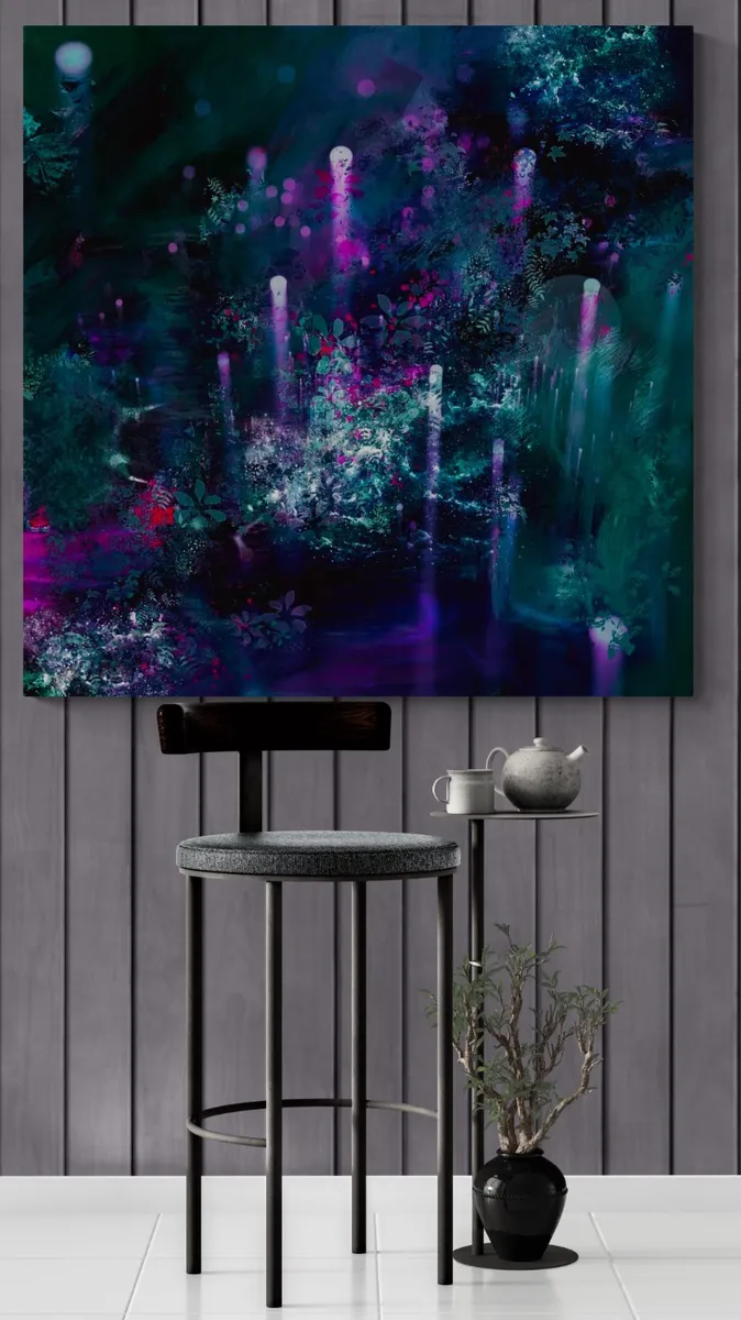 Vibrant hues of purple, magenta, pink, and emerald green dominate a dynamic and abstract scene, resembling a fantastical forest or mystical garden with little creek. Light beams and bubbles add a sense of motion and depth, blending with floral shapes that seem to float ethereally in the space.