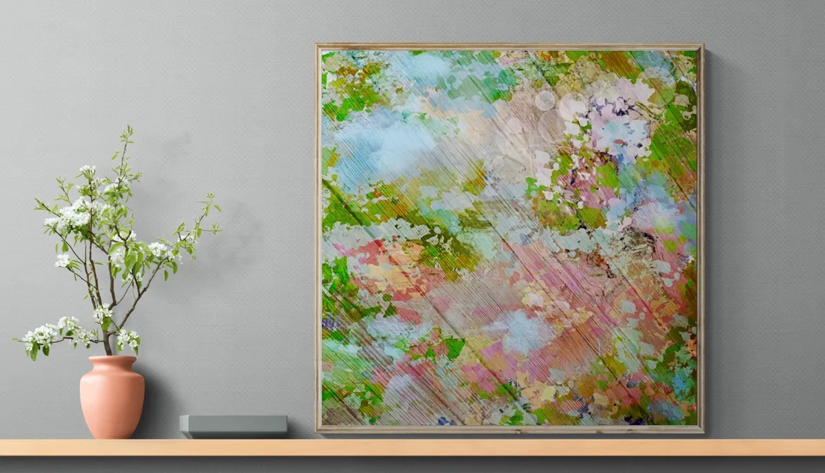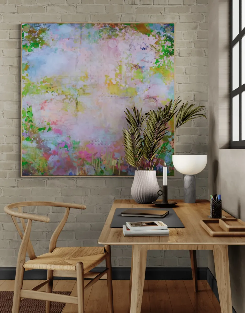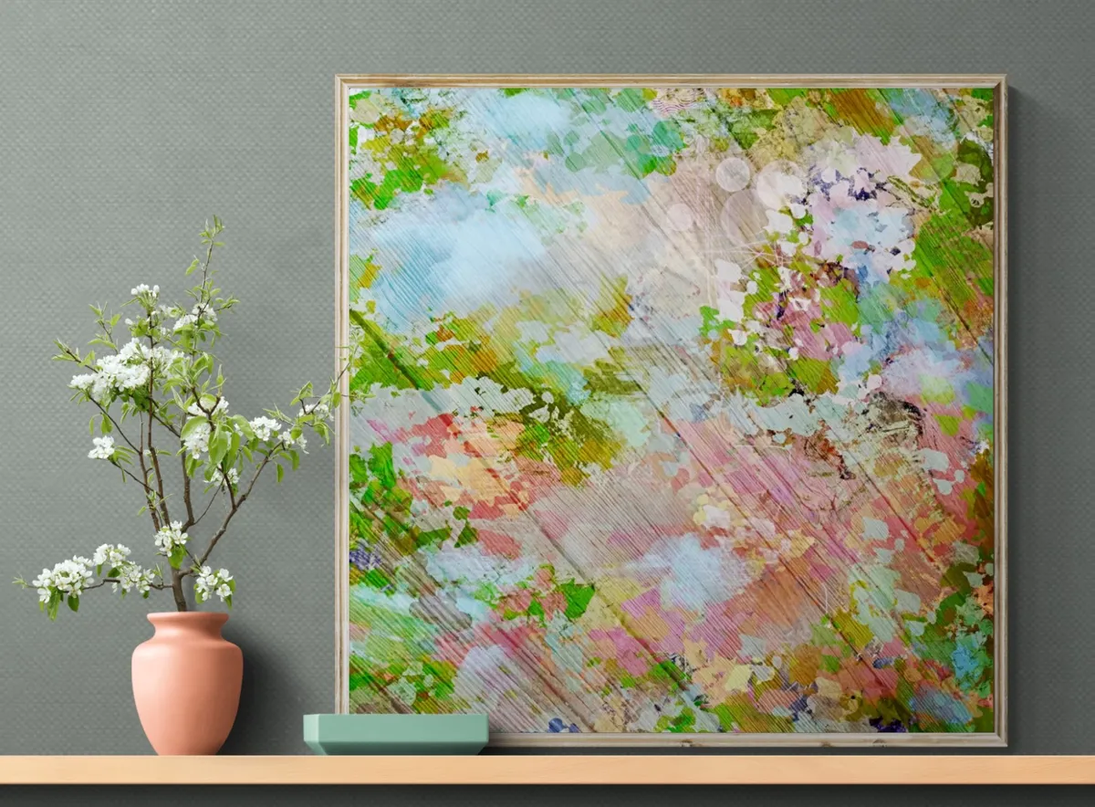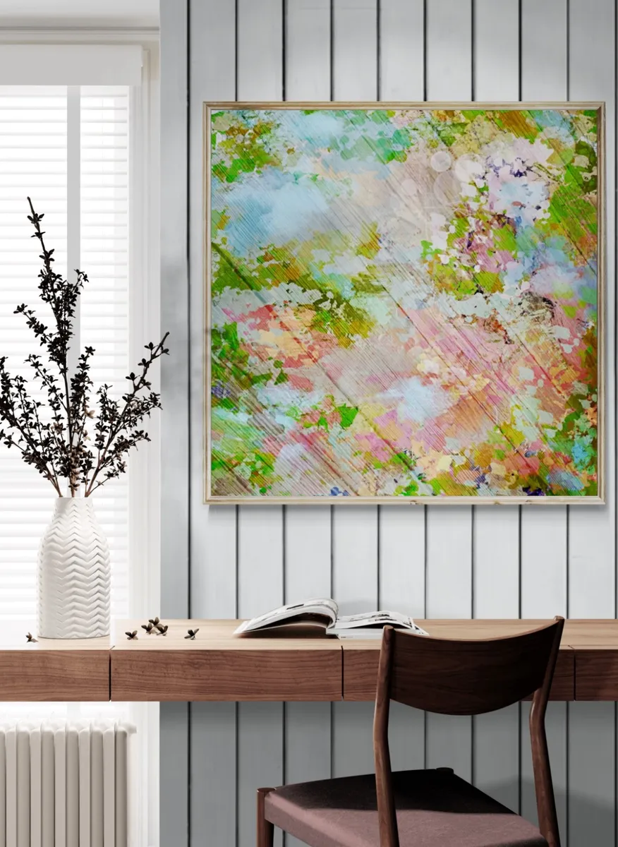 Vivid hues and abstract patterns merge to create a vibrant composition reminiscent of a lush, dreamlike garden. Splashes of pink, green, and blue dominate the piece, offering a visual feast that stimulates the senses and encourages free association.