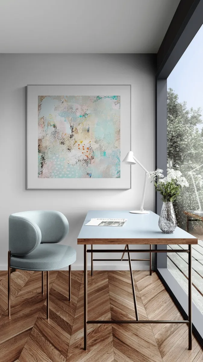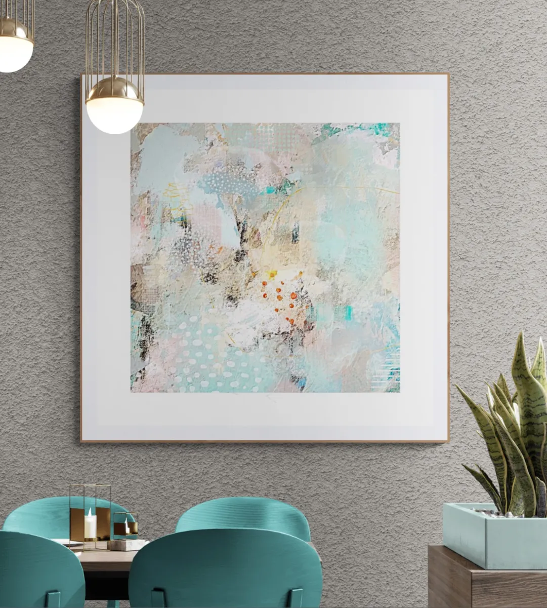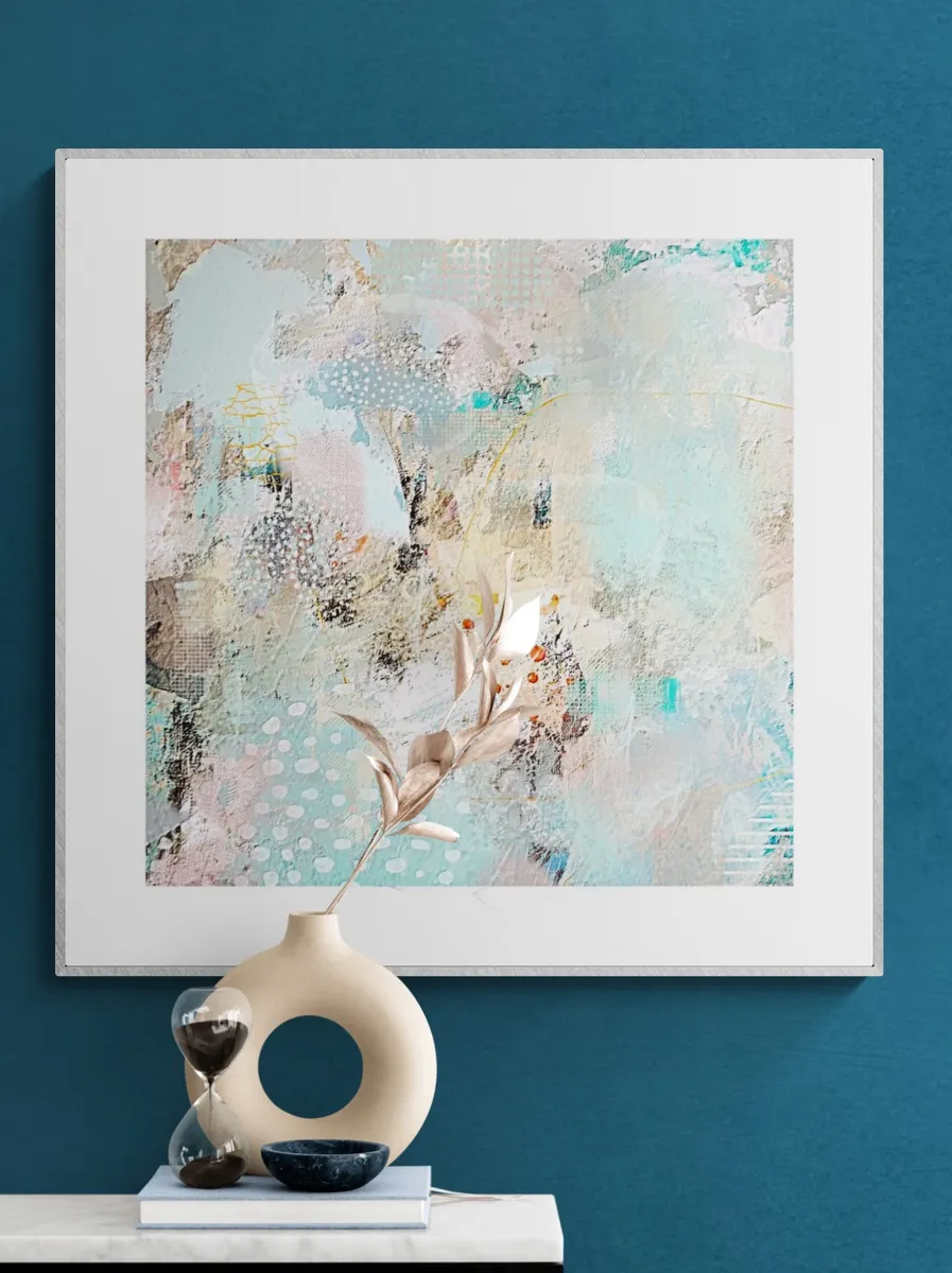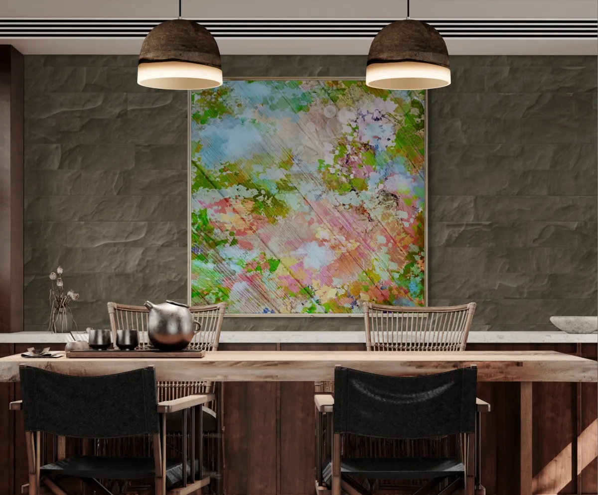 Vivid hues and abstract patterns merge to create a vibrant composition reminiscent of a lush, dreamlike garden. Splashes of pink, green, and blue dominate the piece, offering a visual feast that stimulates the senses and encourages free association.