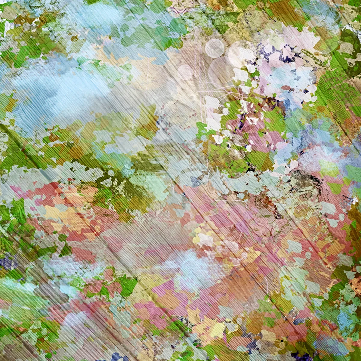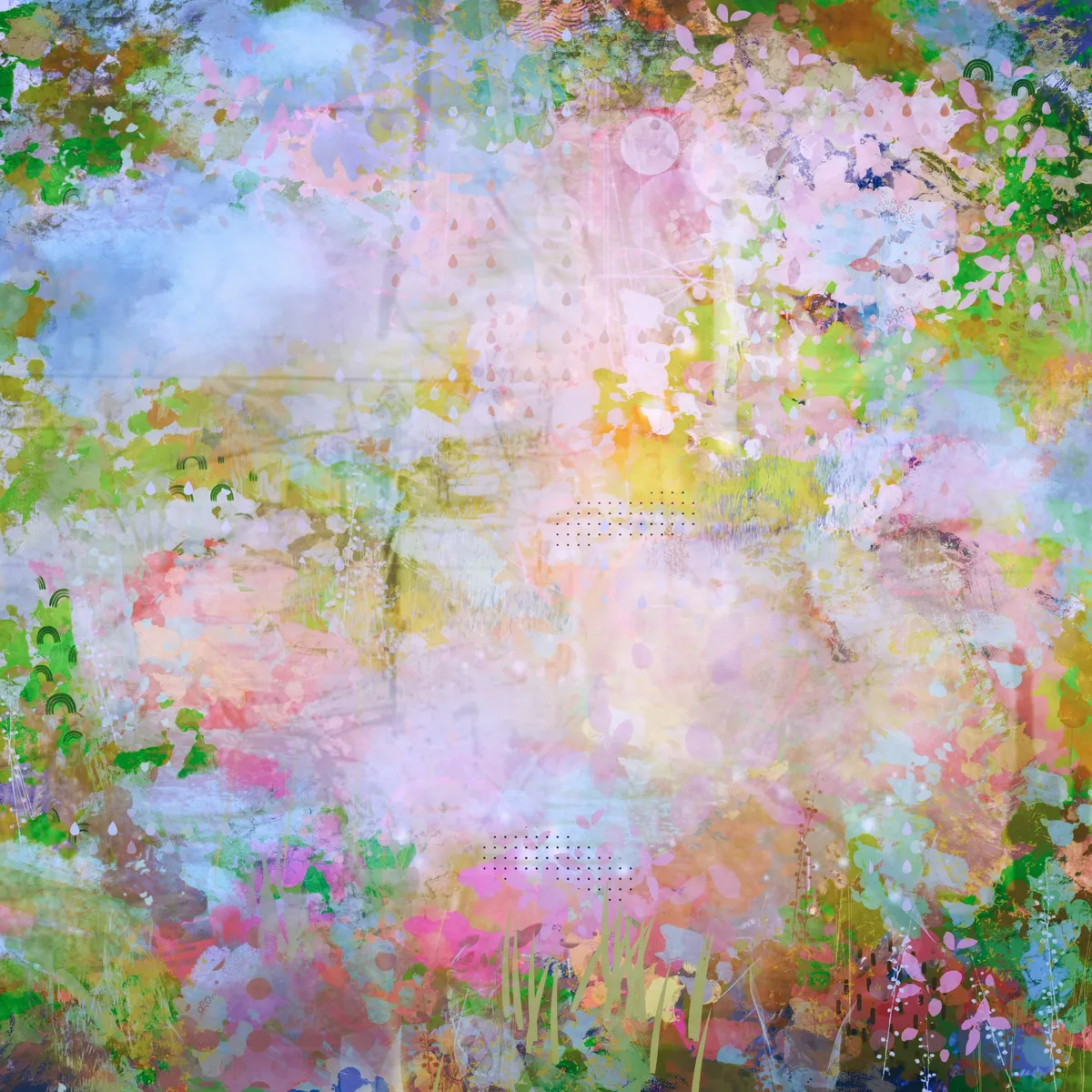 A vibrant mix of colors blends together in an abstract fashion, with hints of floral and organic shapes scattered throughout. Splashes of blue, pink, and green dominate the scene, creating a dreamy, impressionistic feel.