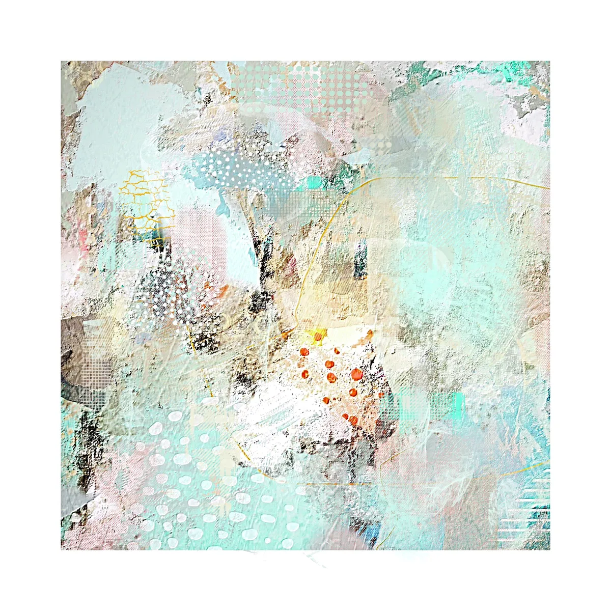 A blend of cool and warm hues creates an abstract composition with textured layers and a variety of marks and shapes. Splashes of aqua contrast with patches of orange and white dots, suggesting a free-form exploration of color and form.