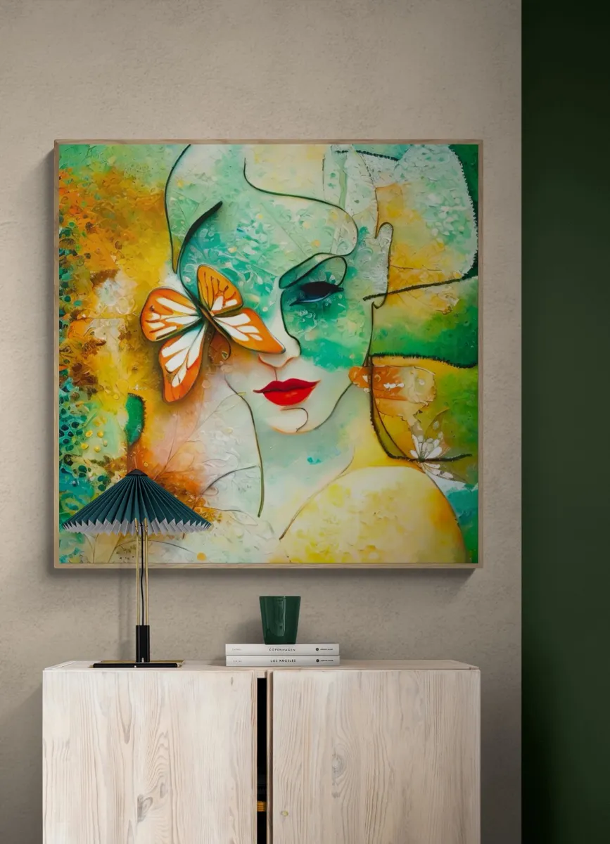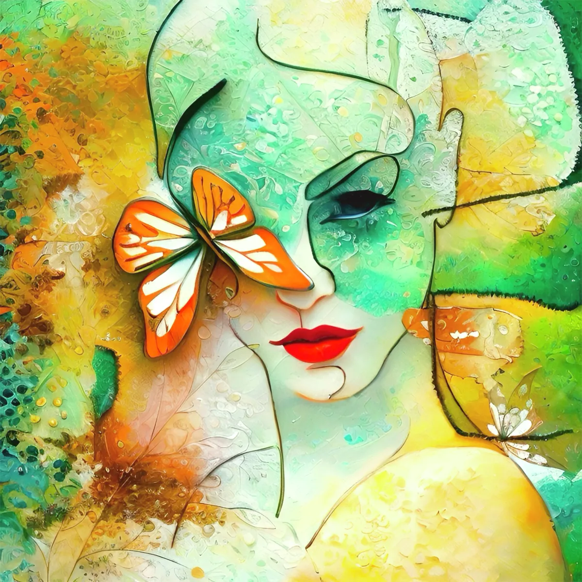 A vibrant and colorful portrayal of a woman's side profile is presented, accentuated with a butterfly resting on her face. Her red lips stand out against the array of warm and contrasting colors surrounding her, creating a striking visual effect.