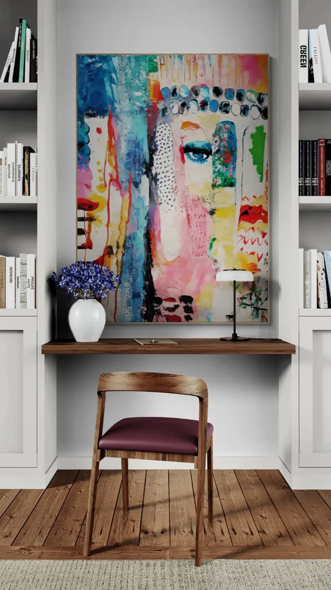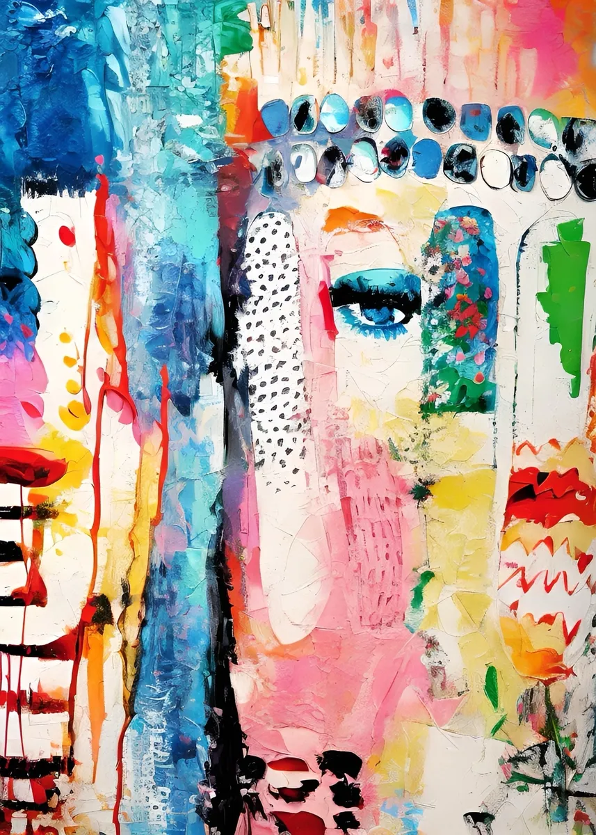 A vibrant and colorful abstract piece features what appears to be a partially obscured faces with a prominent eye. Drips, splashes, and various marks create a dynamic and fun visual experience.