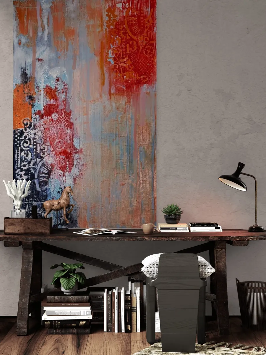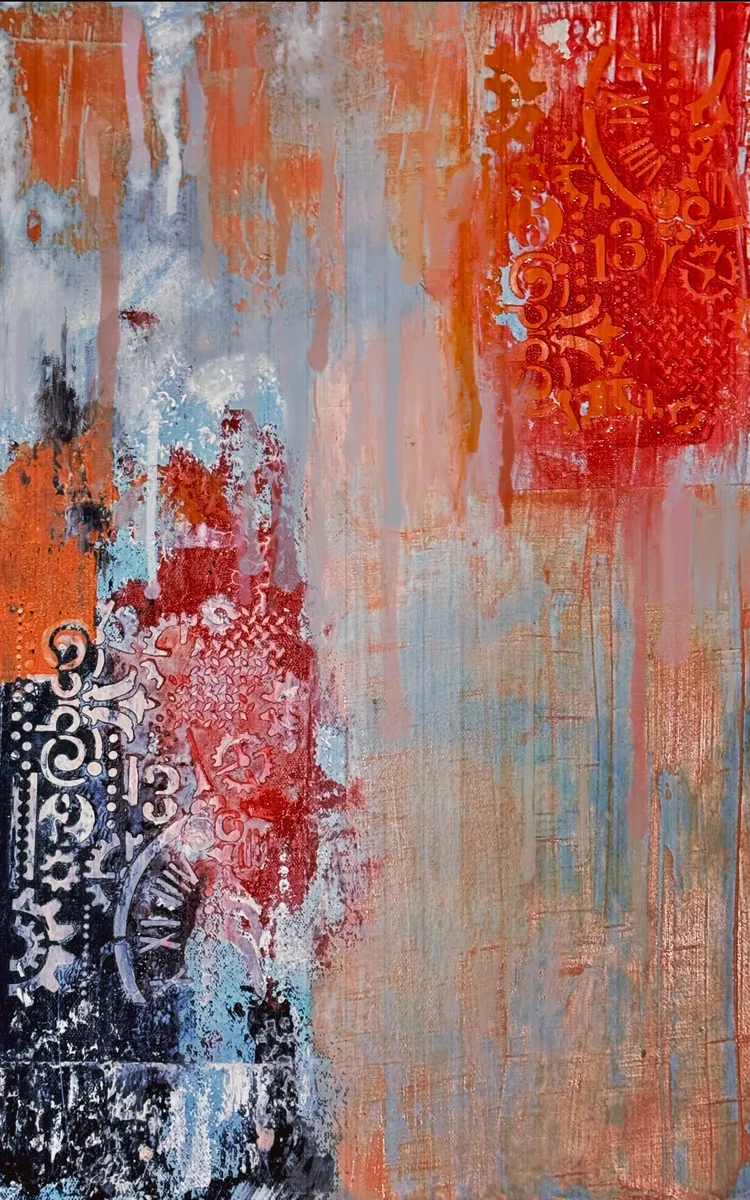 An abstract piece featuring shades of blue, orange, and red with intricate patterns and stenciled numbers scattered throughout. The colors blend and bleed into each other, creating a dynamic and textured effect. Time melt away represent constant change through time.