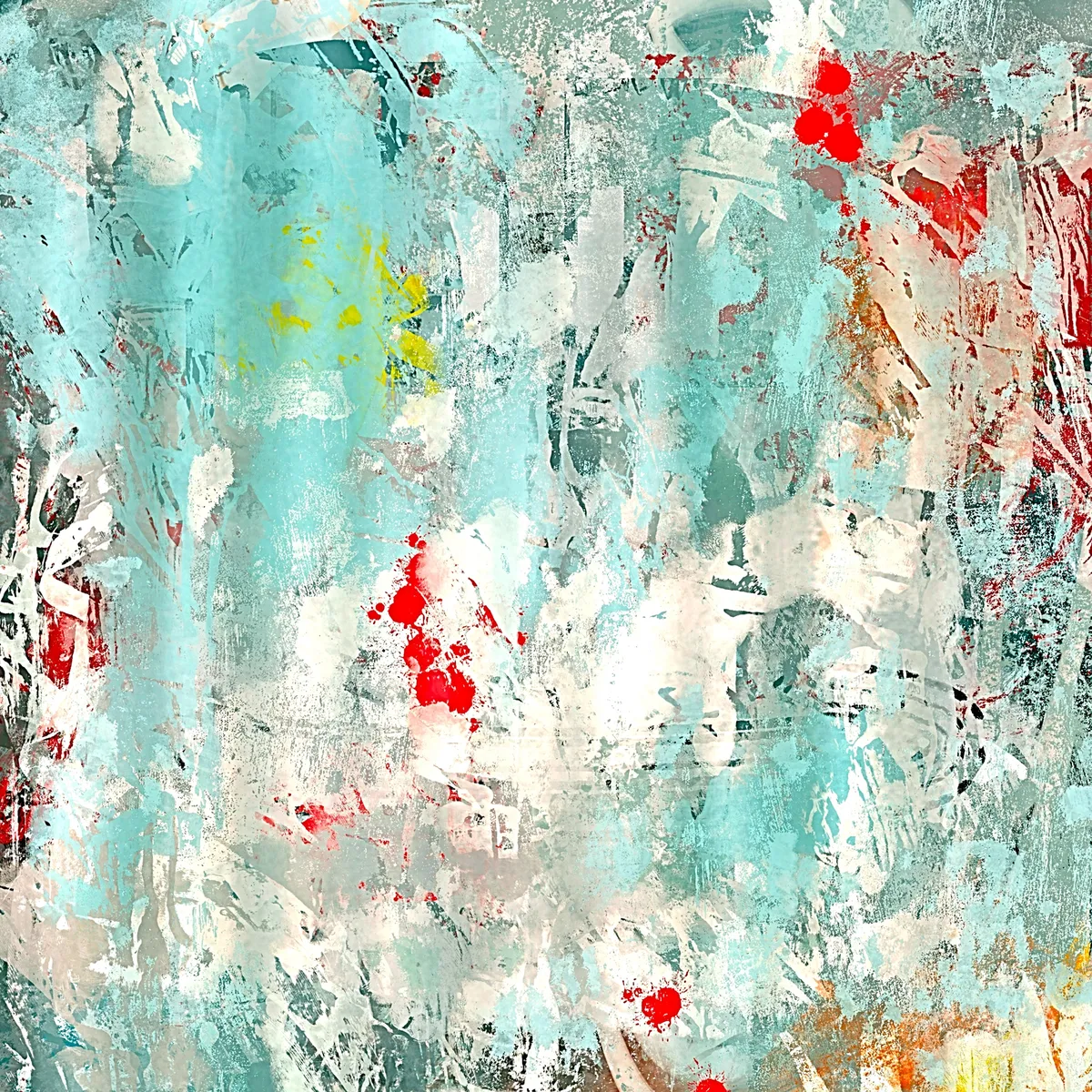 A vivid composition featuring an abstract mix of bright red, white, blue, and splashes of yellow. The colors blend and contrast, creating a dynamic and energetic visual experience.