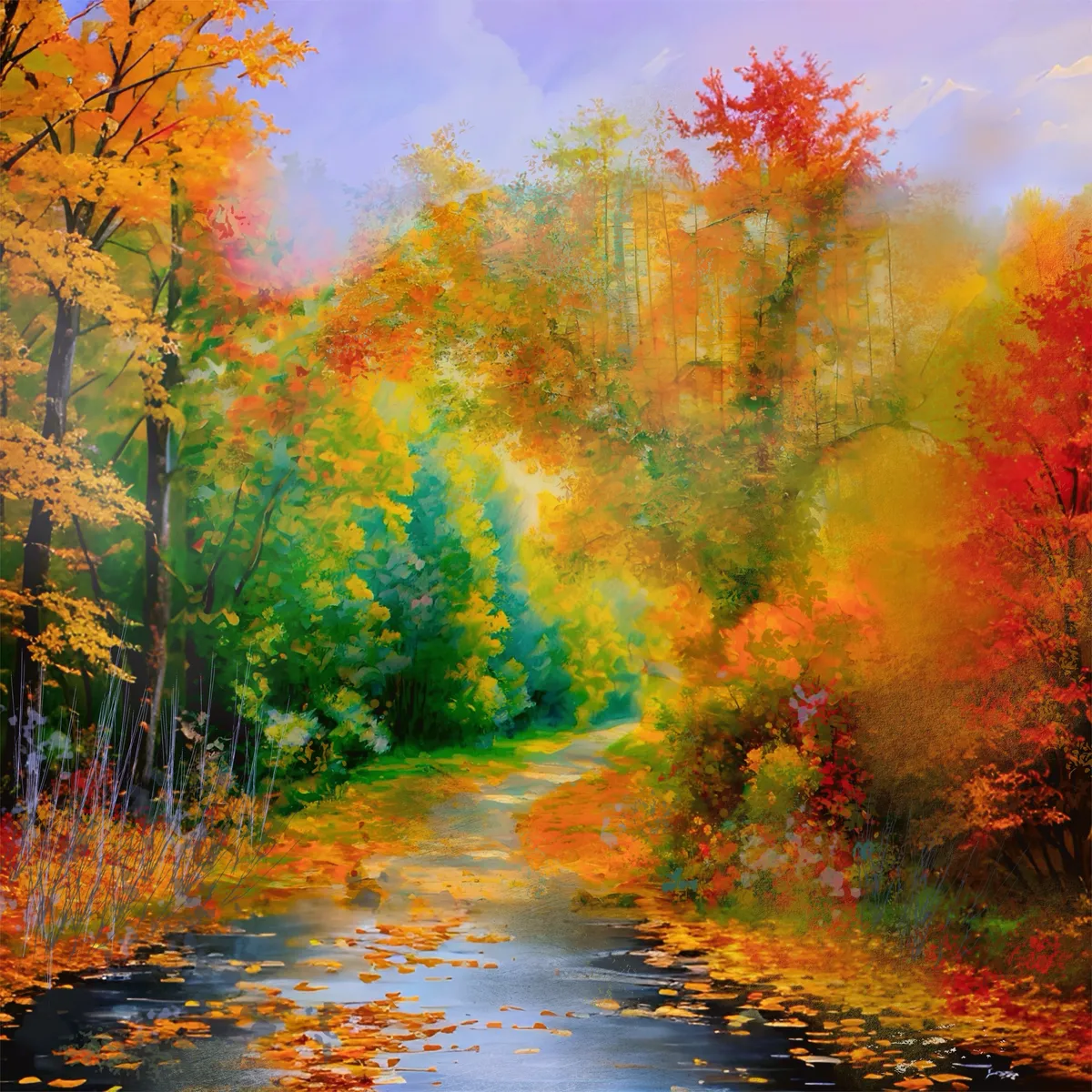Breathtaking forest scene showcases the rich colors of autumn. Under a purple sky, trees in yellows, oranges, and reds frame the pathway as it disappears into the dense woodland. Hope you like the purple sky as much as i do😄