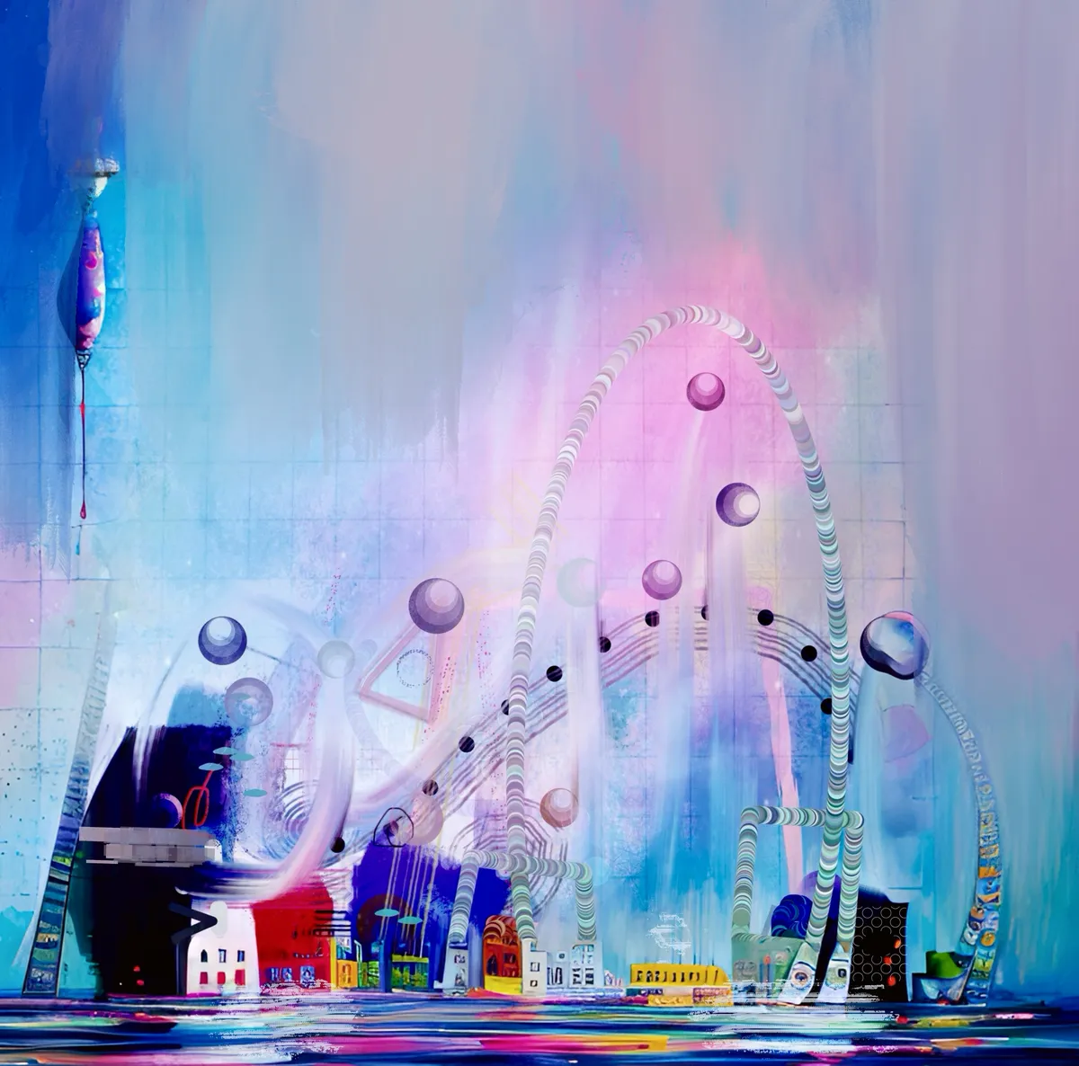 Colorful abstract forms and lines create a dynamic, futuristic cityscape featuring imaginative architectural elements