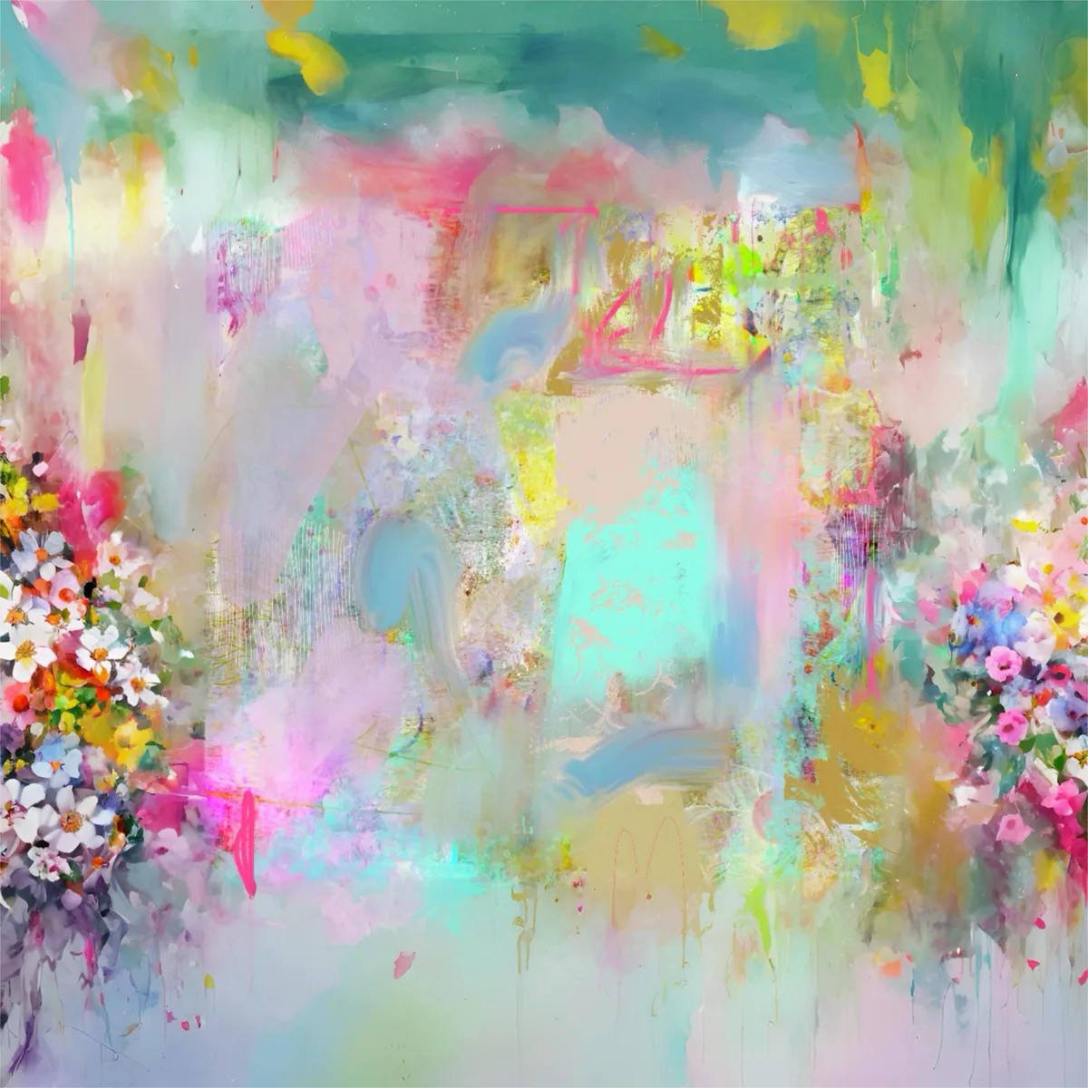my exploration of emotion through abstraction and organic form. This work transforms longing into light — replacing sorrow with stillness, and distance with quiet harmony. The composition, balanced between two floral clusters, suggests a dialogue of presence and absence. Color flows with restraint: soft turquoise, blush, and pale gold merge like memory dissolving into air. The result is a visual meditation — a space where tenderness endures beyond words. My preference of silence defines into practice. I paint not the noise of emotion, but its echo — subtle, resilient, and profoundly human.