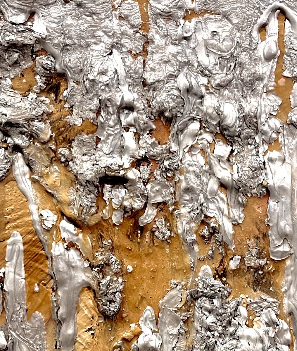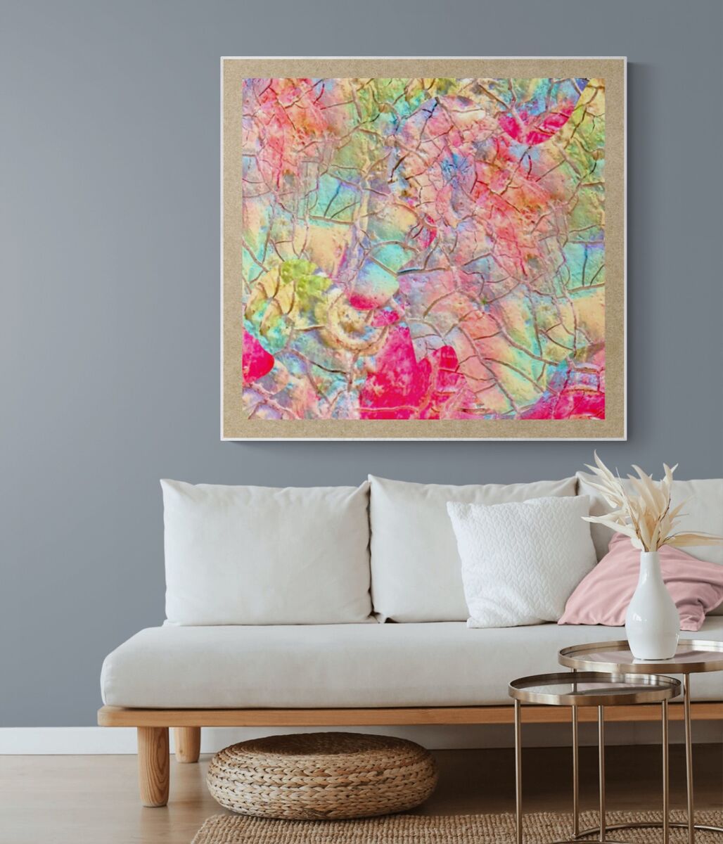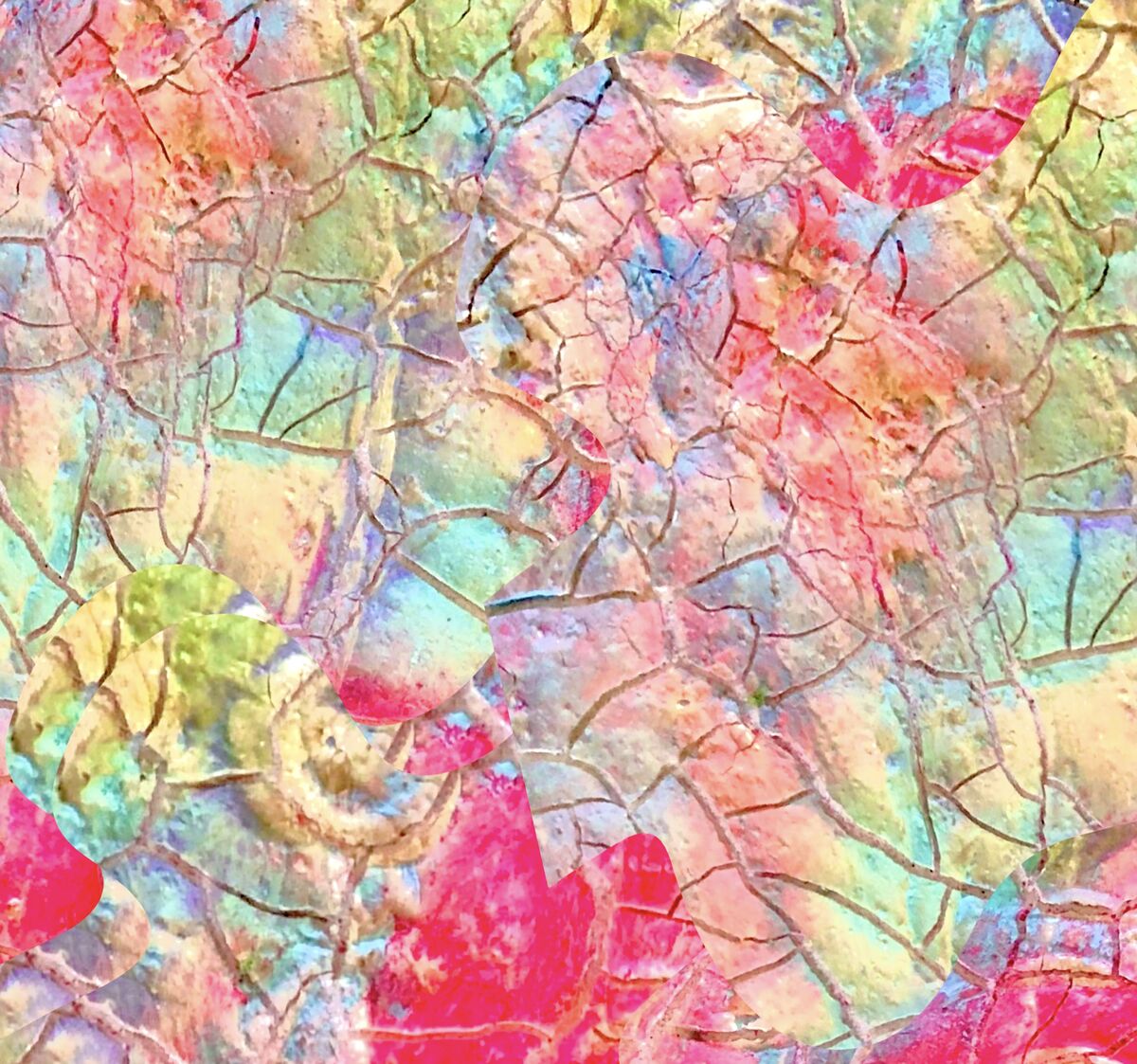 The colorful painting is about a tropical garden that evoked a happy cheerful feeling. The cracked media were bentonite clay mixed with calcium carbonate.