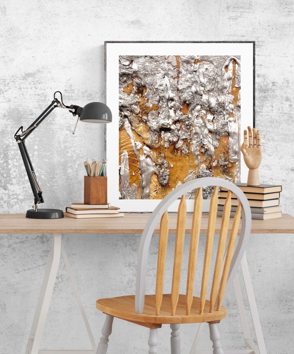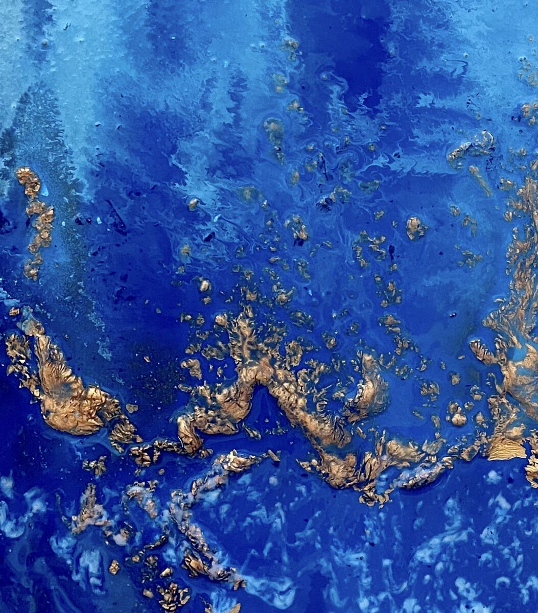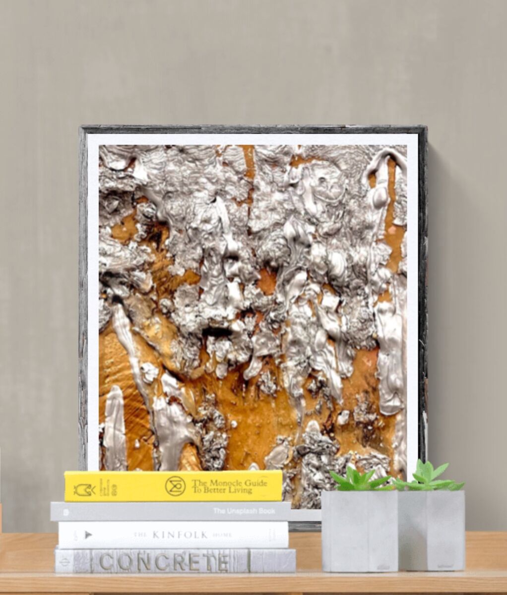 The colorful painting is about a tropical garden that evoked a happy cheerful feeling. The cracked media were bentonite clay mixed with calcium carbonate.