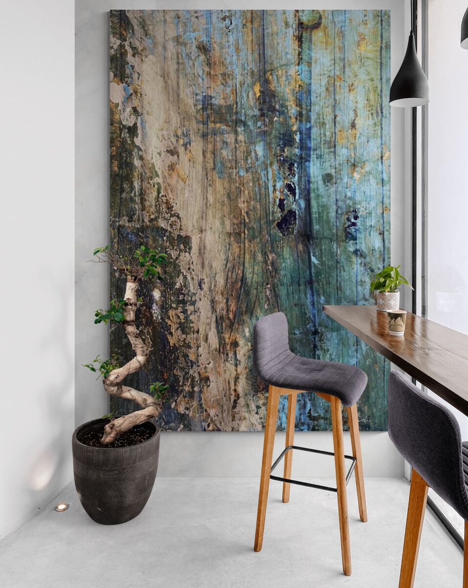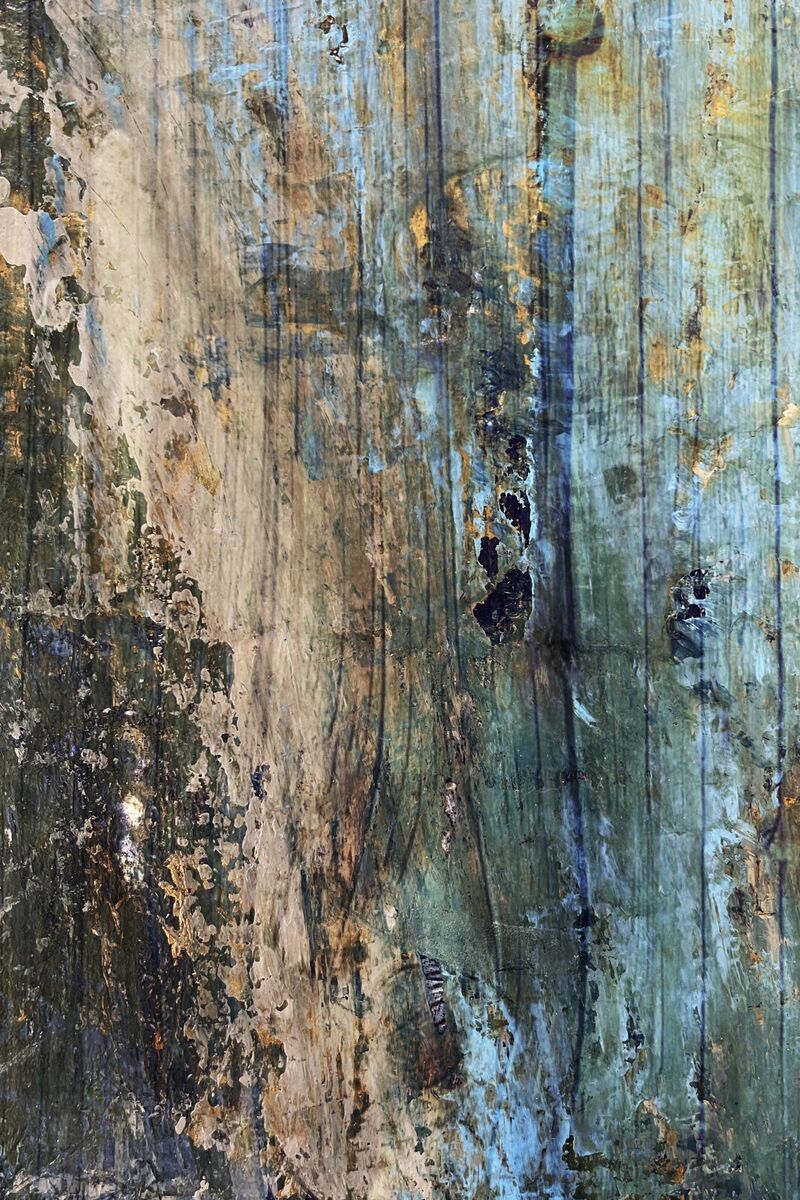 vibrant mix of green and yellow hues, along with patches of blue, spread across a weathered wooden surface, giving it a rustic charm. The uneven distribution of colors and the worn-out look contribute to a sense of age and history.