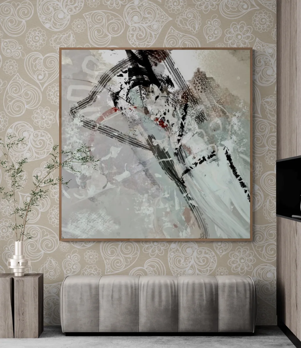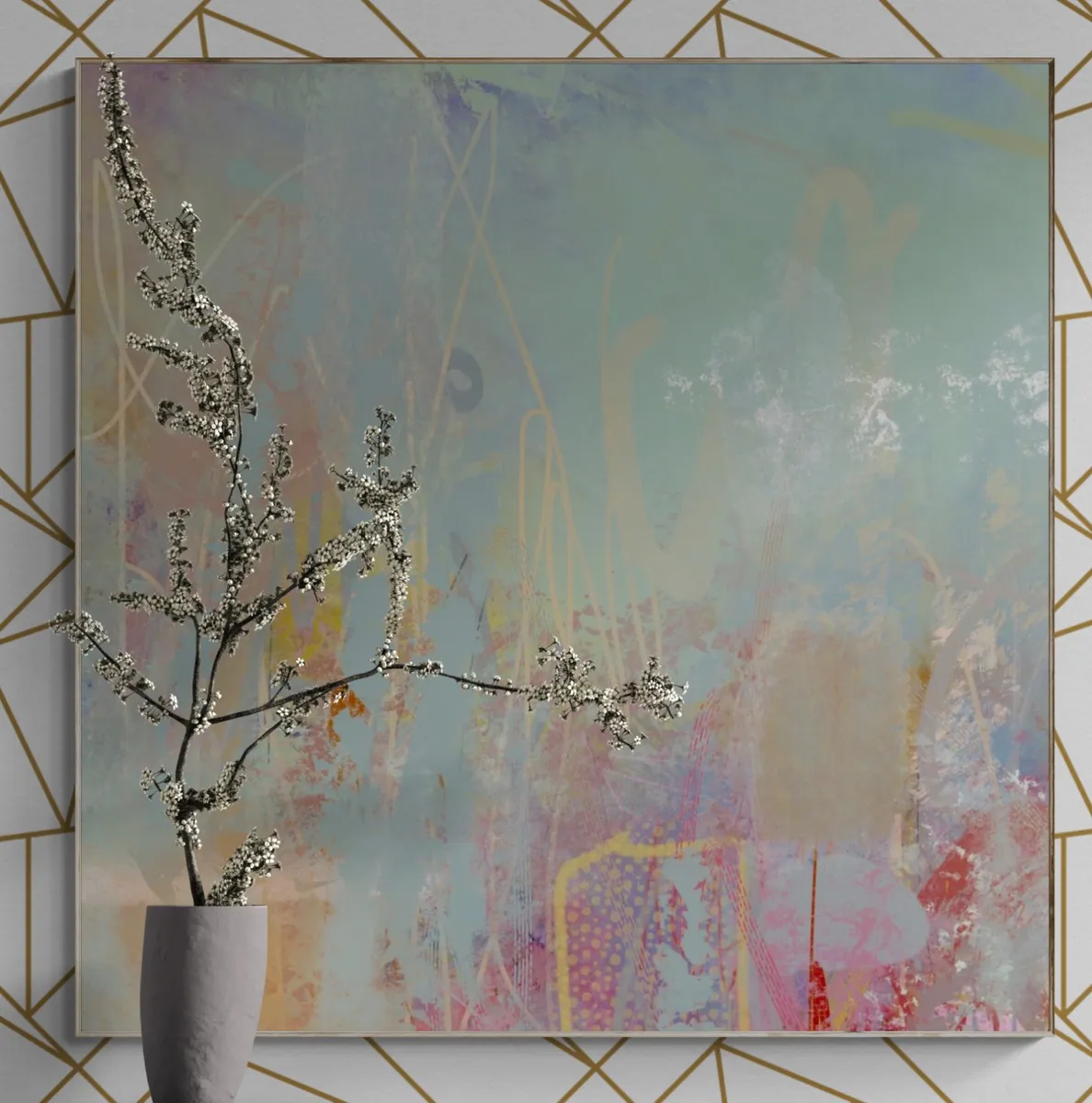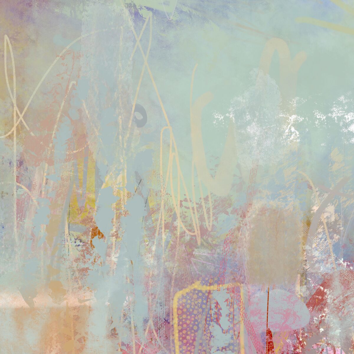 Green. Calming. Serene. A blend of soft pastel hues is overlaid with textured strokes and dots, creating an abstract design. The mixture of scribbles, splatters, and various shapes generates a sense of organized chaos on the surface.